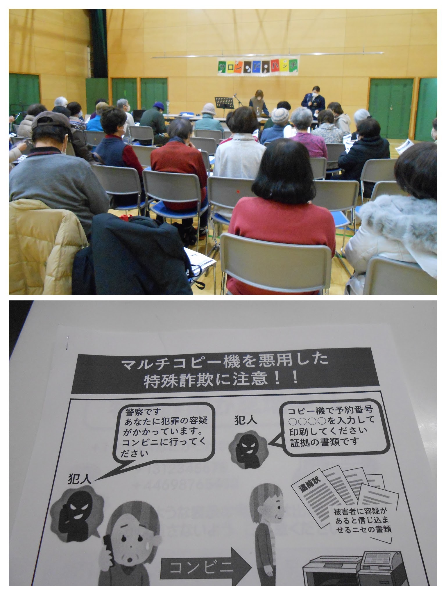 道路状況が悪く忙しいところ、八軒交番のおまわりさんも来てくれました。また新手の詐欺の注意喚起。今度はコンビニのマルチコピー機を悪用したものです。みなさんご注意を!!